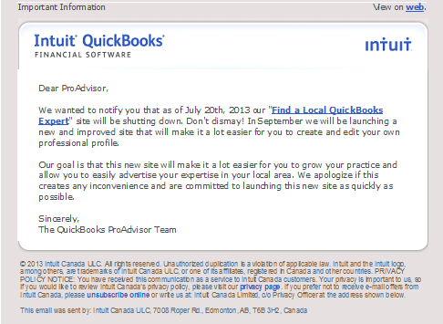 This weekend, the ‘Find a Local QuickBooks Expert’ search wizard for Canada will be gone. But it’s only temporary! In September, a new and improved site will be launched. Here’s the announcement: