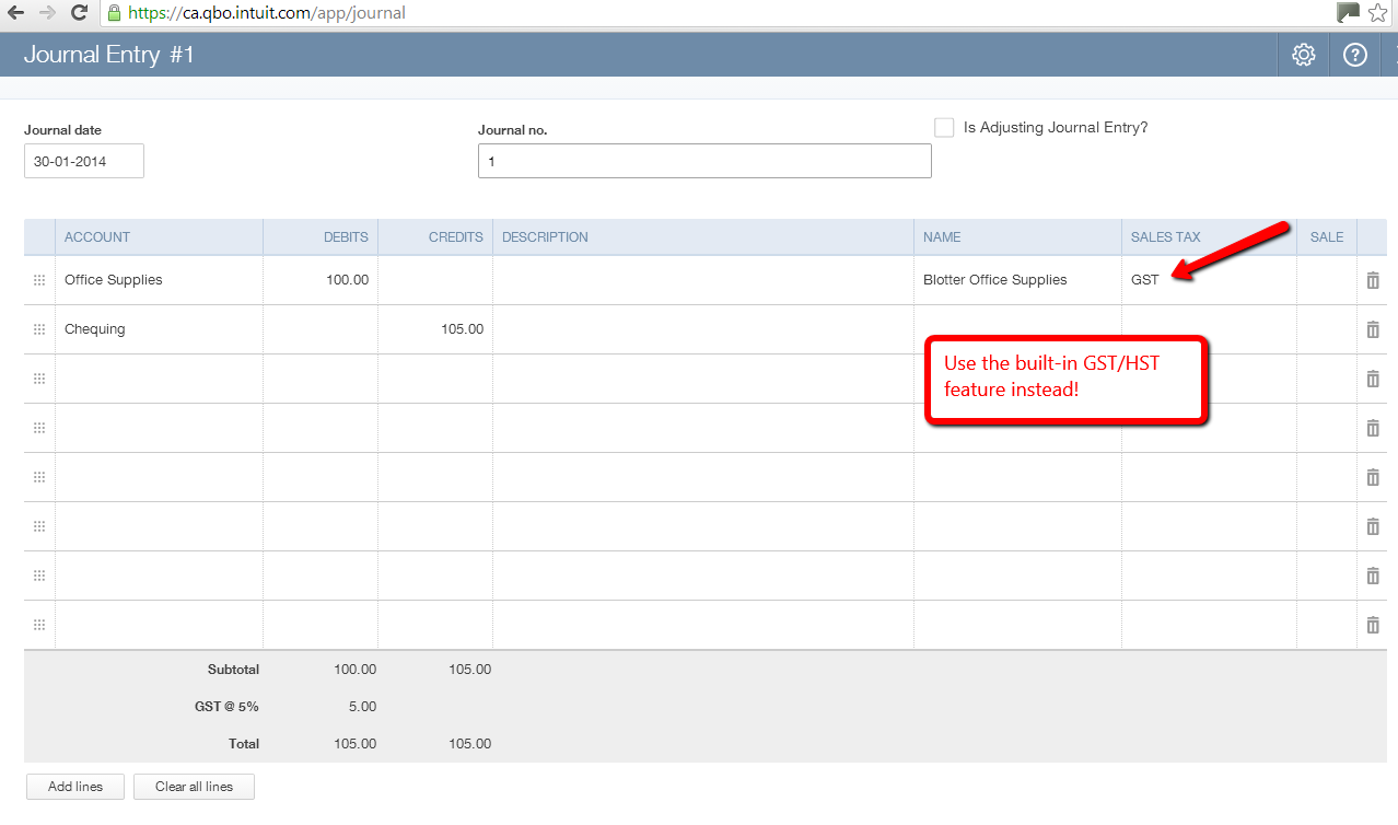 9. Posting directly to the GST/HST Payable account via journal entry is BAD, even though it’s allowed. Although it will post to the balance sheet account, it won’t show up when you go to file a sales tax return. But don’t panic, Intuit has designed something even better – the ability to assign sales tax to each line of a journal entry. No second independent line for GST/HST needed. When entered this way, it will show up on the return. Accountants commonly post directly to the GST/HST Payable account, so please make sure they know this crucial tip.